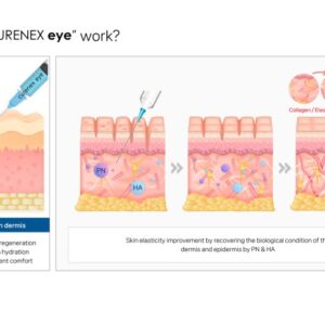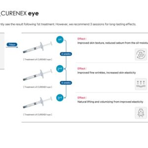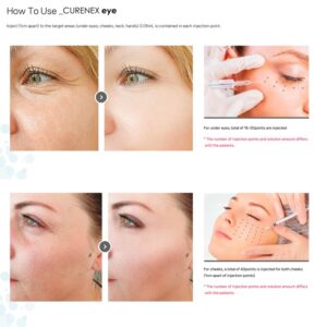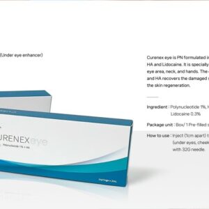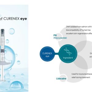 Curenex-eye is a premium PN injecting skin booster which improves the damaged dermis with a tissue regenerating material, purified DNA from salmon milt. This product is supplied in an individual treatment syringe and is packaged for single-patient use, ready for injection. The number of units per package and the volume contained in each syringe is as stated on the package.