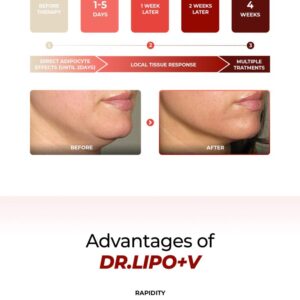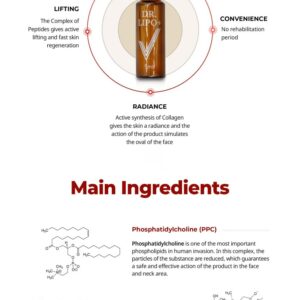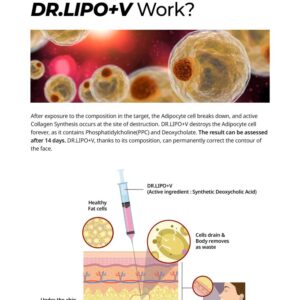 Dr. Lipo+ V is a new generation of V-Line contour solution. It is aimed at a quick and effective fight against fat deposits in the face and neck area. After the destruction of fat cells, the peptide complex, which is part of Dr. Lipo+ V gives an amazing lifting effect. After exposure to the composition in the target, the adipocyte cell breaks down, and active collagen synthesis occurs at the site of destruction.